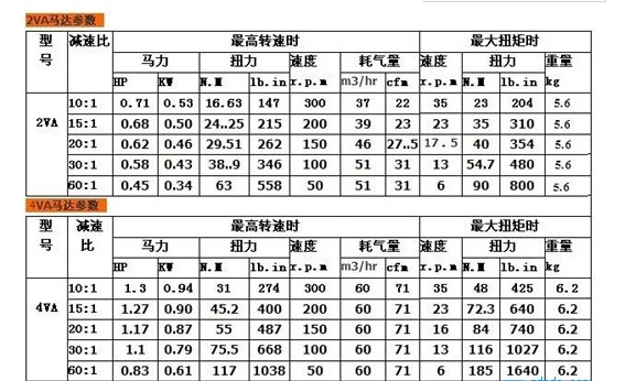 马达放出的扭力先经过变速箱作“可调”的扭矩放大(或在超比挡时缩小)再传到终传(尾牙)里作进一步的放大(同时转速进一步降低),最后通过输出轴将动力释放出来。我厂的两款4VA、2VA减速马达通过10:1--60:1齿轮变速,完美的使扭矩最大化,达到大功率马达的效果而马达还是低耗气小体积,所以比较有特色,且成功申请了专利。下表例举马达参数:
