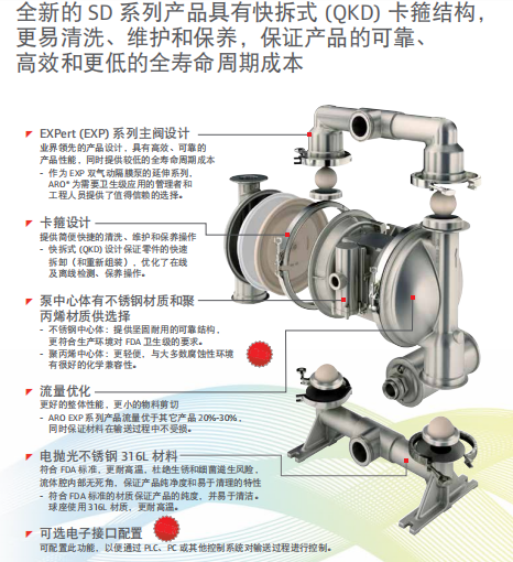 符合FDA标准的英格索兰INGERSOLL RAND ARO®隔膜泵安全可靠且质量优异,同时还具有业界领先的全寿命周期成本。英格索兰INGERSOLL RAND ARO品牌的FDA泵传承了EXP系列的高效率和坚固耐用设计,在满足输送洁净无污染的同时,也提高了生产效率和用户体验。